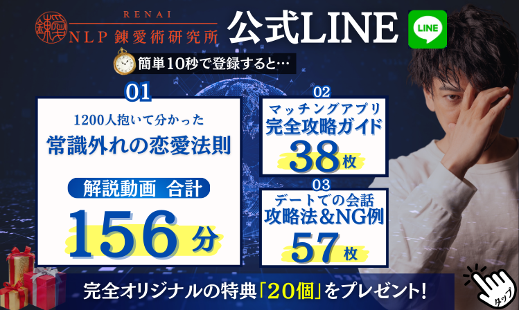 1200人抱いてわかった「本当の恋愛ノウハウ」を公式LINEで配信しています。期間限定の20大特典もあるのでぜひ登録してください!